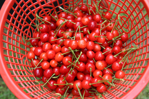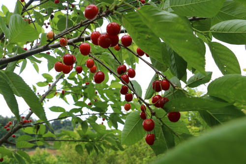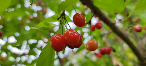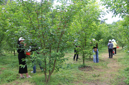 “快来这边,这边的樱桃更红些……”樱桃林里,来来往往的游客们提着篮子穿梭着,寻找自己中意的樱桃。