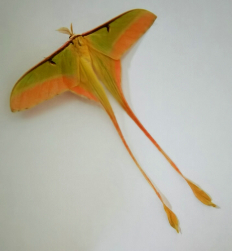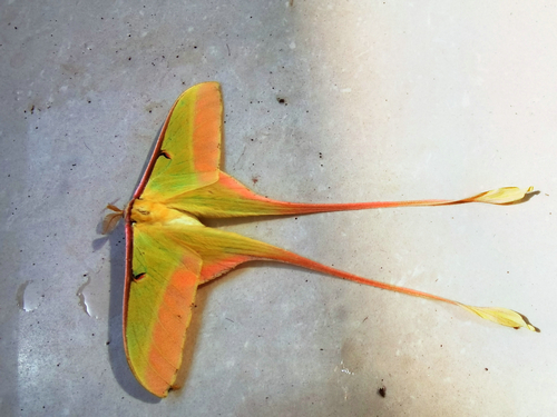 它到底是何方神圣?据黄荆自然资源站站长颜宇介绍,这只昆虫学名叫红尾大蚕蛾,是世界上尾突最长的蛾之一,最为特别的是尾突末端也长有一个明黄色斑点,色彩极为绚丽。