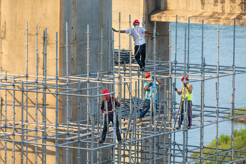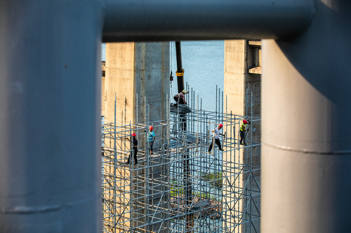 四川新闻网消息(李贵平 记者程海英)5月6日,泸州市合江县城市长江公路大桥桥墩下,工人们正在搭建脚手架,为大桥防撞设施工程建设作准备。