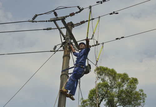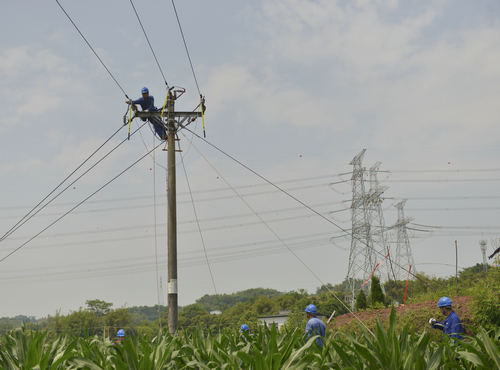 抢修工作有条不紊地进行着,电杆上毫无遮挡,不一会,供电员工便满头大汗。