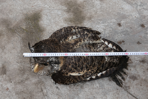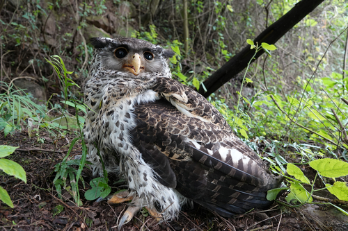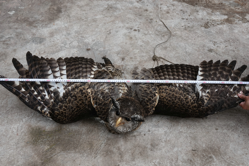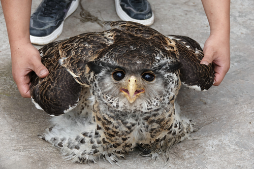 古蔺县自然资源和规划局野生动物保护人员接到电话后,立即赶往两河口村进行调查处置。经工作人员仔细辨认体态特征后,确定“大怪鸟”是一只林雕鸮成鸟,体长60厘米,重约4千克,全身羽毛布满乌黑色斑纹,两只大眼镜乌黑发亮,头顶两边耳羽耸立,不停咬合鸟喙发出“科科科”的声响,属国家二级保护野生动物。