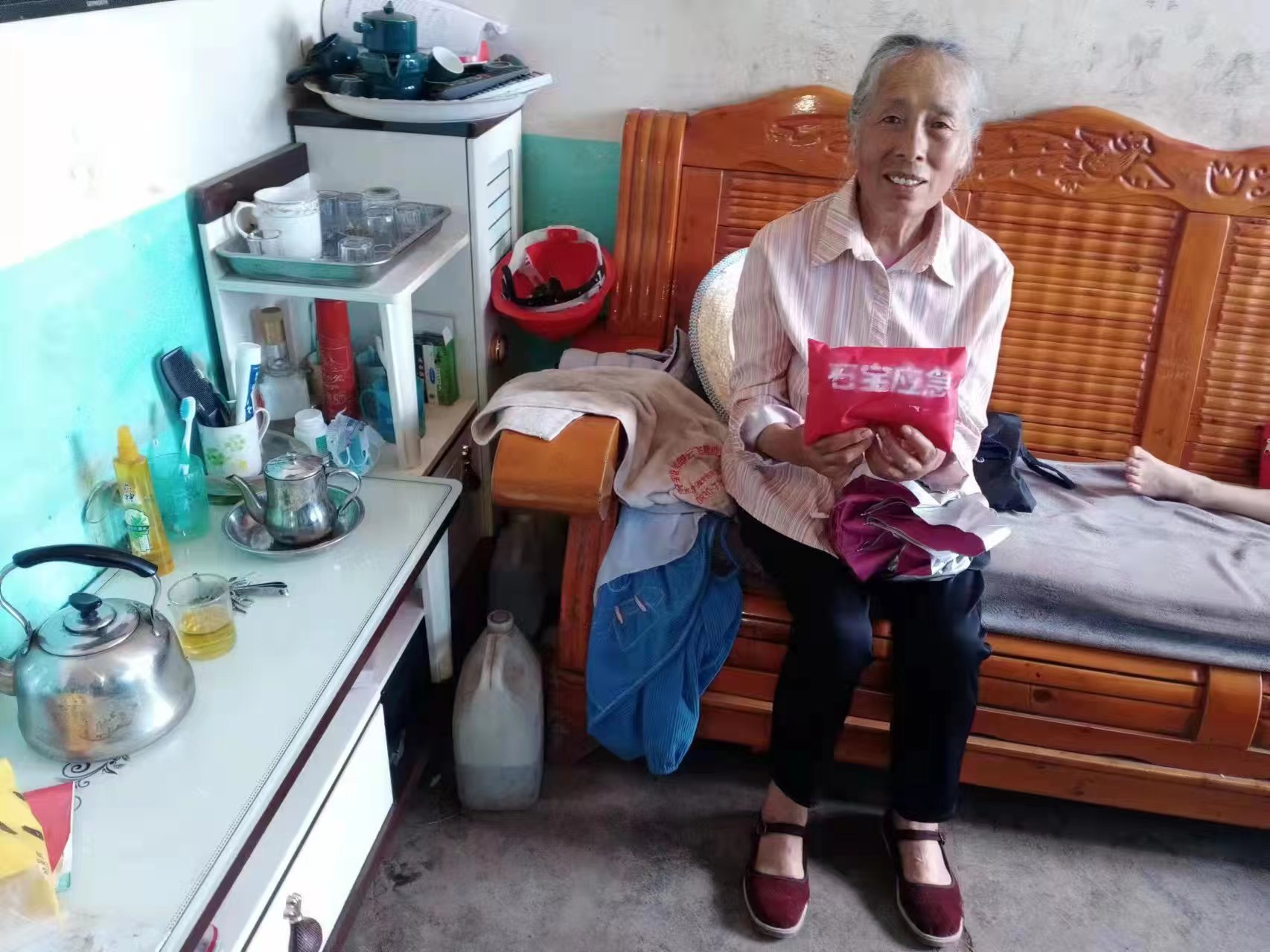 演练结束后,工作人员还向地灾点群众发放“应急包”。该应急包是由石宝镇自发制作的红色小方包,里边装着碘伏、创可贴、砂布、胶布、棉签等急救物品。