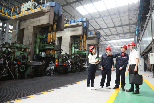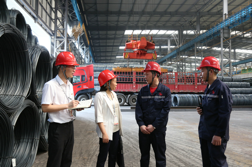 | 营商环境观察员李智慧(左二)深入鑫阳钢铁生产车间,收集企业在生产过程中的难点、堵点,帮助企业排忧解难 |