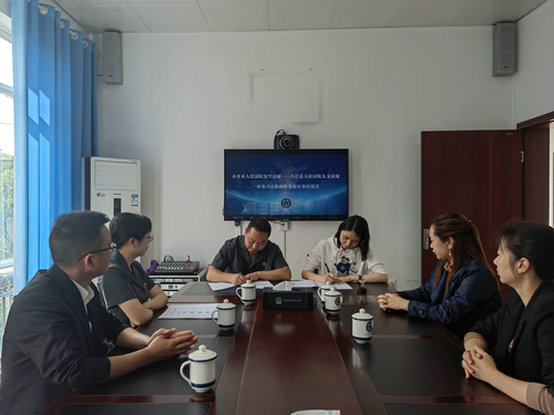 九支法庭与复兴法庭仅一水之隔,倚靠独特的地域优势,两地法庭选择建立司法协作关系正是“合作共赢”的举措。在复兴法庭庭长带领下,九支镇政法委员、九支法庭副庭长、法官等一行人实地参观了法庭诉讼服务大厅、审判庭、调解室等,详细了解了该庭的审判管理、文化建设等方面情况,进一步增进两地法庭合作共识。