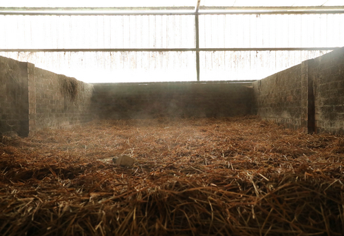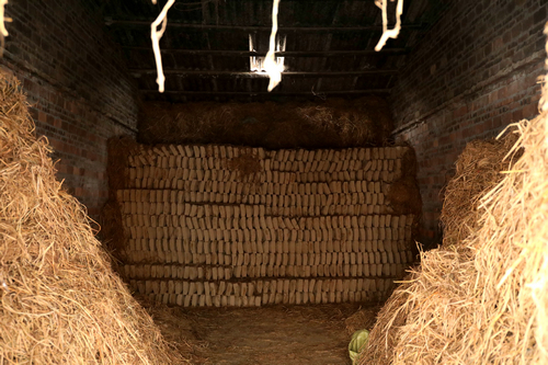 | 用机器压制好的曲坯会被送入曲仓,用色泽金黄、无霉变的稻草包裹堆置 |