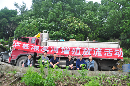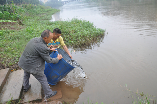 在位于泸县玉蟾街道的濑溪河翘嘴鲌蒙古鲌国家级水产种质资源保护区放流点,干部群众们把鱼苗分批分次放流到濑溪河中。