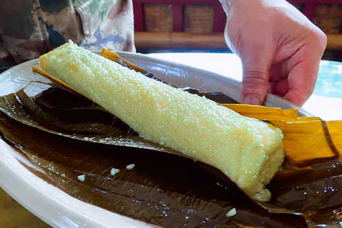 将长粽煮熟冷却后,用线切成圆饼状,再蘸上白糖和黄豆粉拌作的配料,入口的瞬间,是香甜、是软糯、是口齿生津、欲罢不能。
