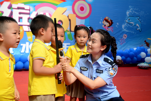 法警叔叔阿姨们现场讲解各种警械“神器”的名称和用途,小朋友们好奇地触摸警械,零距离感受这些武器的威力。法警们演示了制服“坏人”的情景,孩子们一双双小眼神无不透露出崇拜之意。