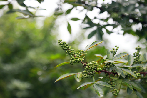位于白沙镇会龙村的青花椒基地里,郁郁葱葱的花椒树上,粒粒饱满油亮的花椒挂满枝头,椒香扑鼻,椒农们正兴高采烈地忙着采收花椒。刚采摘下来的一摞摞花椒堆放在路边,工人们将花椒打捆装袋,抬上小货车,运送到附近的烘干房进行烘干,这样的忙碌场景已经持续了好几天。