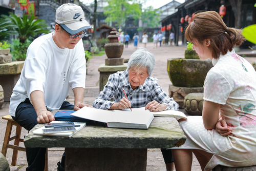 | 合江县尧坝镇白村80高龄的美术爱好者李关富在老师的指导下参加写生活动 |