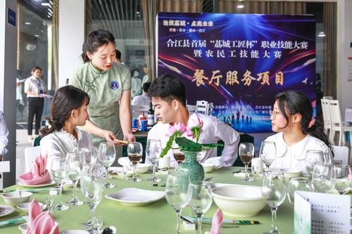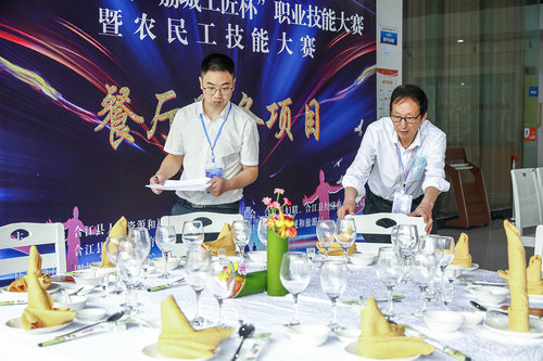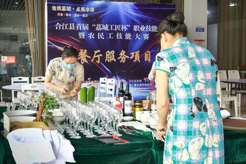 | 参加餐厅服务项目比赛的选手(左2)在模拟向顾客提供餐饮服务。 |