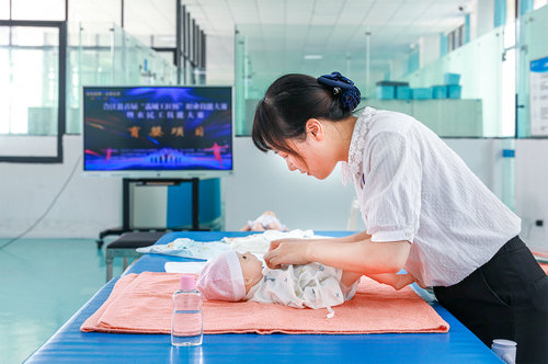 | 参加育婴项目比赛的选手在认真护理仅有6个月大的婴儿。 |