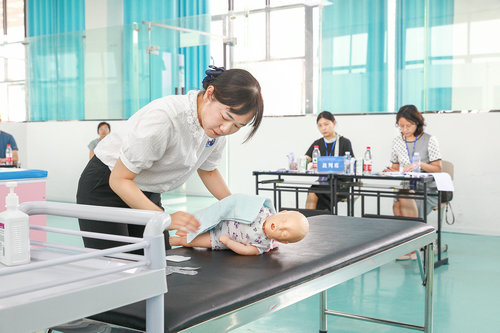 | 参加育婴项目比赛的选手在演示婴儿咽噻食物的应急处置技能。 |