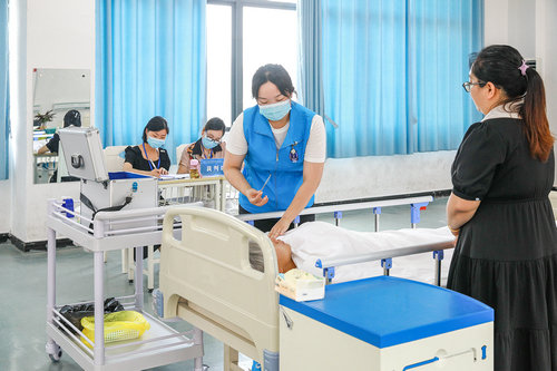 | 参加养老护理项目比赛的选手(中)在为卧床不起的老人检测体温。 |