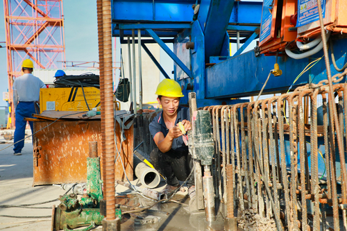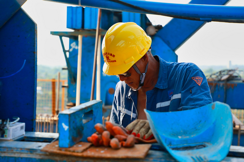 针对持续高温天气,四川省泸州市龙马潭区内各个在建项目积极做好防暑降温保障措施,推行错峰施工,全力保障项目目标节点建设。图为7月12日下午6时,在渝昆高铁川渝段重点控制性工程——泸州沱江特大桥施工现场,趁气温下降,工人们正在离地面100多米的塔柱上进行作业。