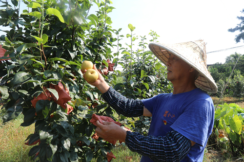 “老叶,你看我给你带了好帮手!”采摘间,大冲头村第一书记赵世海带着几名游客前来叶贵华的果园体验采摘,帮助他解决“采摘正当时人手又不够”的问题。