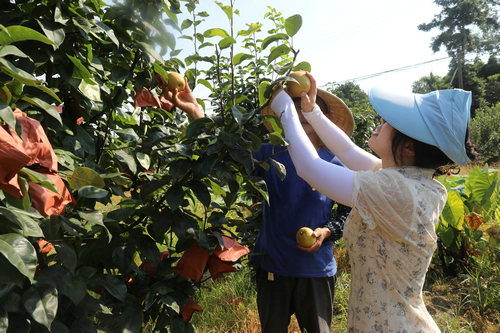 果园里,大家顶着高温干得热火朝天,忙得不亦乐乎。叶贵华家今年种植翠冠梨3亩多,预计收入1.5万元。翠冠梨采摘完,自家的黄金梨又该上市了,柑橘园里的橘子也沉甸甸压弯了枝头。又是一个丰收季,全生产队54户人家300多亩的脆冠梨,今年又卖到了好价钱。看着一筐筐梨子装箱运走,叶贵华心里比吃了蜜还甜。