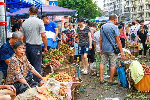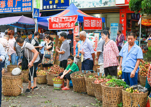 | 2022年7月17日,合江县马街荔枝交易市场上人来人往,荔枝交易红火 |