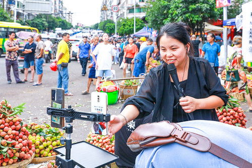 | 2022年7月17日,合江县马街荔枝交易市场上,来自符阳街道三块石村的胡丽在自己的荔枝销售摊点上进行现场直播售货 |