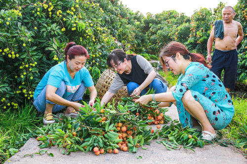 | 2022年7月16日,合江县荔江镇柿子田村荔枝示范园区内,市民将刚采摘的新鲜荔枝进行二次择选 |