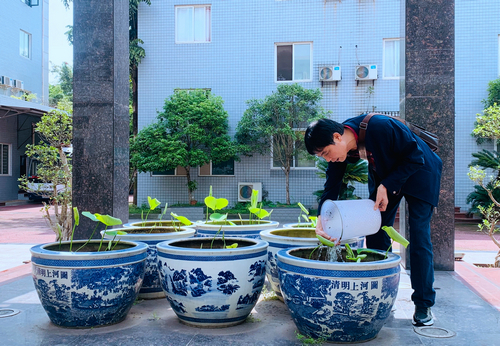 这样的风景可不是随便就有,那是曾光宏用心呵护的成果。平时工作再忙,下班后他都会抽出时间去照顾它们,换水、换盆、清洁,忙得不亦乐乎。在他的悉心照料下,“小荷才露尖尖角,早有蜻蜓立上头”的灵动美景才得以让大家见到。