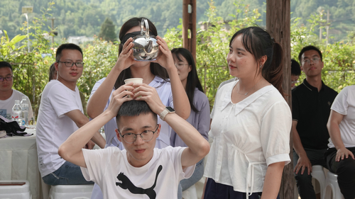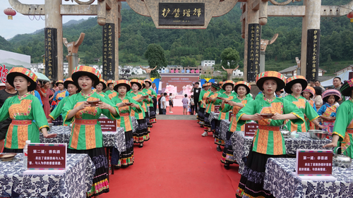 青年们乘车来到泸州市古蔺县大寨苗竹乡富民村迎新广场,伴随咪啋们动听的歌声,十二碗祝福酒让青年们感受到苗家儿女对远道而来客人的热情。
