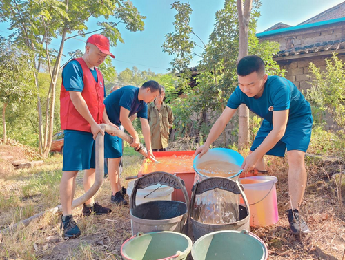 8月1日清晨,满载清水的消防车驶入镇村小道,停到院坝门口。在石龙镇太公寺村二社的取水现场,乡联会成员与消防官兵一道,铺管、挑担、抬水,为群众提供贴心的取水服务。