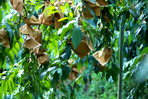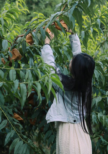 “套袋是为了防虫、防细菌,把套袋一取,每个都圆润饱满,金黄诱人。”32亩黄桃树上,一个个黄桃从套袋里钻出来,迫不及待的想看看这人间烟火。