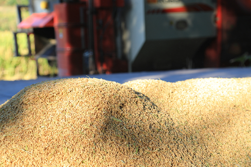 一大早,大桥镇上房村就热闹起来,农民们正热火朝天地收割着田里的水稻。随着田间穿梭的收割机发出“轰隆隆”的响声,金黄饱满的一茬茬水稻就被卷进收割机,分离出来的稻谷成堆摆放。