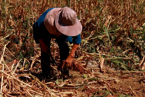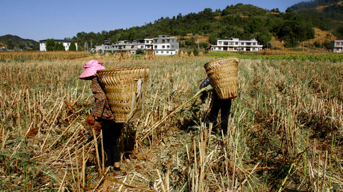 “足蒸暑土气,背灼炎天光,力尽不知热,但惜夏日长”,农民正在拾捡收割机遗漏的高粱穗。