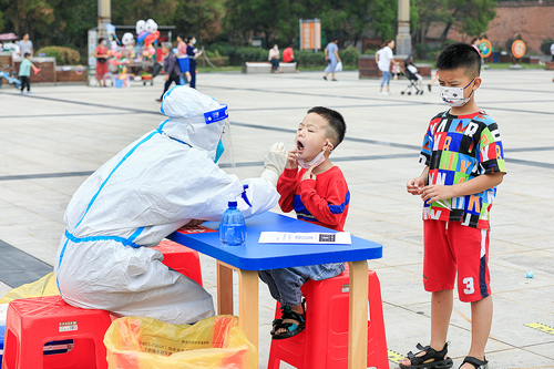 | 2022年9月18日,四川省泸州市合江县贵妃广场上,医护人员在为学生们采样 |