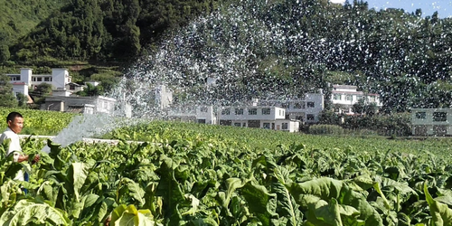 | 四川省古蔺县皇华镇利河村村民杨永辉正在利用朝门水库管道的水给烤烟浇水 |