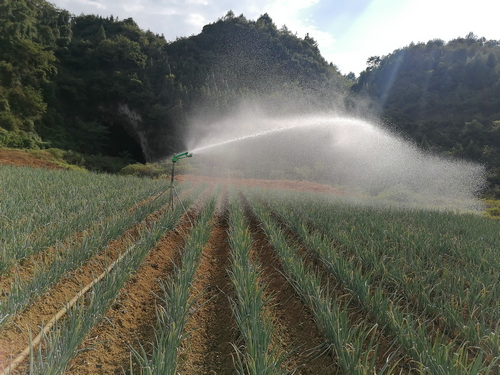 | 村民赖学均利用朝门水库水源给大葱浇水 |