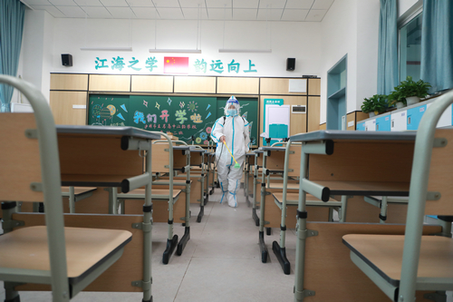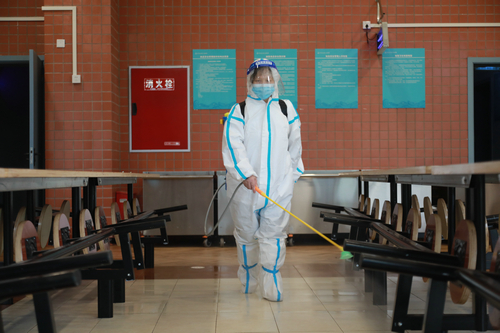 四川新闻网消息 9月22日,泸州市龙马高中江韵学校内,工作人员身穿隔离服、头戴防护面罩、身背一台20公斤重的喷雾器,对校园内教室、食堂、多功能厅等公共区域进行全方位无死角消毒,为学生返校做好充分的准备。