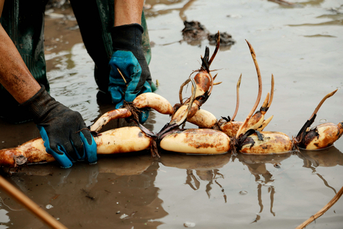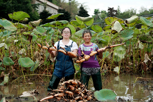 一大早,藕农们就来到藕池开始挖藕,他们身穿长皮裤,一脚下去,藕池的淤泥深陷至膝盖,在藕池里行动已然不易,想要挖出藕来更是讲究技巧,藕农们戴上防水手套,弯着腰熟练地在淤泥里摸索着。