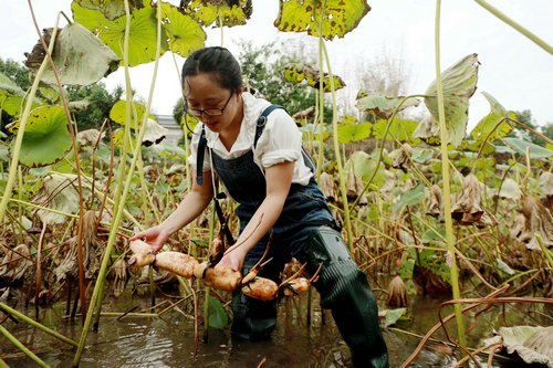 藕农李秀芳在自家池塘里种植莲藕已有8年之久,虽然莲藕池面积不大,但收入却十分可观。“我家池塘里种植的是七孔白莲藕,这个品种更加粉糯,在市场上也更受欢迎。”李秀芳一边挖藕一边说,以前这块田地种植谷物,亩均产量1000余斤,收入1000余元,如今种植莲藕亩均产量达6000余斤,收入能翻10倍以上。当前,莲藕在市场上比较紧俏,一斤藕能够卖到5元钱,所以这段时间是她最忙碌的时候。
