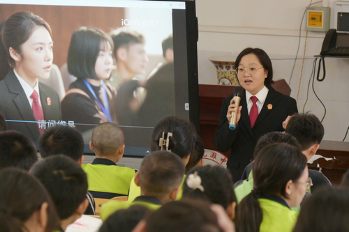 课堂上,熊丽将热播法治题材电视剧《底线》搬上校园荧幕,带领同学们“看剧学法”。通过播放剧中庭审片段,结合自身工作实际,为同学们讲解庭审流程,并解答专业术语,让他们了解基本的法律知识,感受法律的神圣与威严。