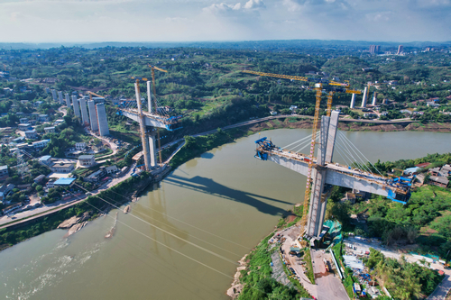 四川新闻网消息 日前,在位于四川省泸州龙马潭区的渝昆高铁沱江特大桥项目施工现场,工人们正在距离地面100多米的桥面上施工。泸州沱江特大桥全长约2613米,主桥塔高113.2米,为国内首座双柱式V型桥塔、首次采用空间索面斜拉索的高速铁路桥,设计时速350公里,主跨采用124+240+124米索加劲刚构连续梁跨越沱江,是渝昆高铁全线最大跨度预应力混凝土刚构连续梁桥。(供稿:龙马潭区融媒体中心)