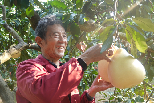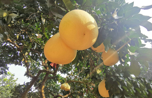 阮方超表示,我们家种植有蜜柚100余亩,目前投产的有50亩,品种有传统的白心、红心蜜柚,今年正式投产的还有金黄蜜柚,金黄蜜柚皮薄肉厚、口感甜脆,深受顾客喜爱,今年我家产出的1000多斤金黄蜜柚已经被抢空,价格是白心蜜柚的一倍,经济效益好。去年,我尝试着在柚子树上嫁接的橙子今年也挂果了,结出来的橙子,略带柚子的清香,果肉纯甜、无渣无籽,甚是好吃。待明年扩大一定种植面,就可以看到产量和效益,若可观,我就打算扩大面积改良品种,实现效益最大化。