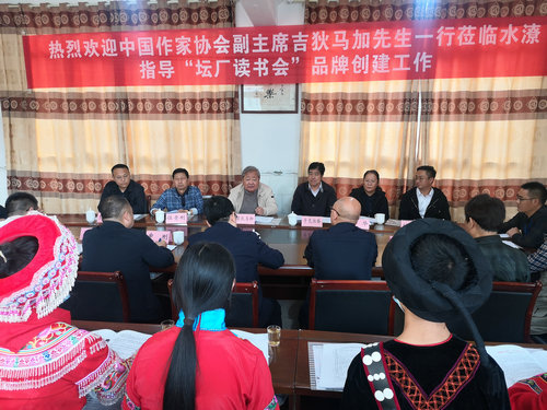 在水潦彝族乡高坪学校,吉狄马加一行实地参观了学校诗词长廊、楹联活动室等地,并出席第94期“坛厂读书会”活动。会上,县委副书记江勇强致辞,吉狄马加作重要讲话。对于高坪学校“坛厂读书会”坚持20年,将诗词教育融入日常教学和“立德树人”工作,为弘扬国学经典,促进青少年传统文化熏陶,促进民族团结进步,厚植家国情怀作出的不懈努力并取得积极成效表示认同和肯定。