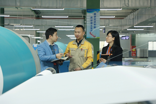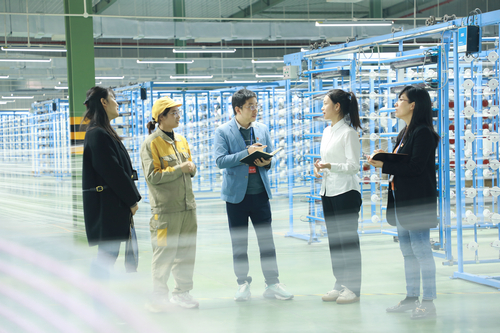 图为2022年11月16日,该区纪委监委相关工作人员在中国(四川)自由贸易试验区川南临港片区恒力(泸州)产业园内向车间工人了解相关情况。(供稿:龙马潭区融媒体中心 杨尚威 曾永强)