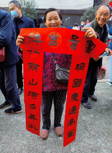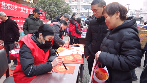 笔墨抒美意,佳联迎新春。活动现场,书法家们伏案挥毫,为赶集的群众写福字、撰春联,写下美好的祝愿:“喜兔年初开春色,继虎岁再展宏图”“天增岁月人增寿,春满乾坤福满门” “迎新春江山锦绣,辞旧岁事泰辉煌”,飘着墨香的“福”字,苍劲有力的春联,不仅为广大群众带来了新春祝福,也让现场群众体会到了中华传统民俗文化的魅力,不少年轻人也加入到写春联活动中,亲手把美好的新年愿景写在纸上。活动现场充满了浓浓的文化年味,赢得现场群众阵阵赞美喝彩。