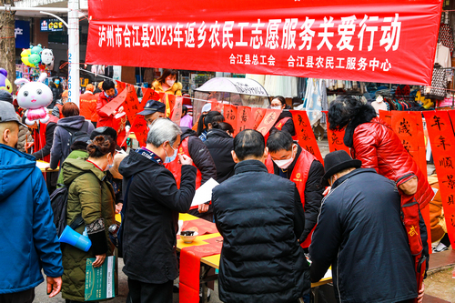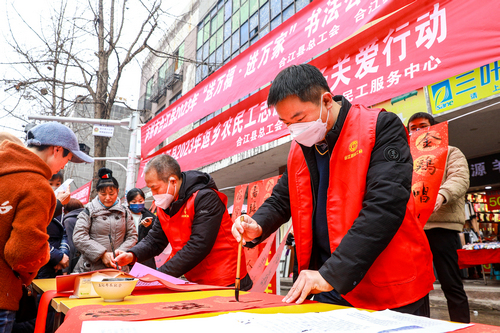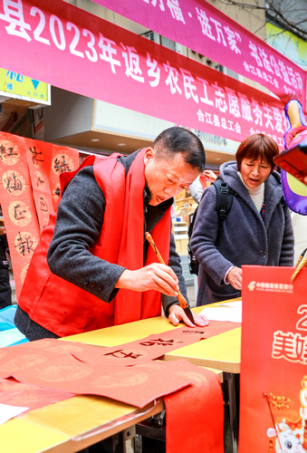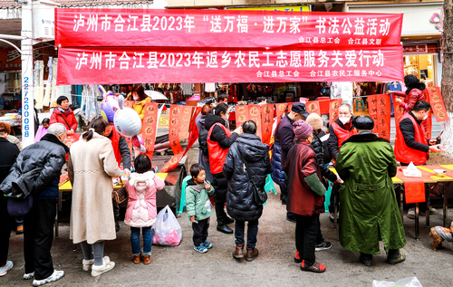 | 1月12日,合江县组织党员干部、书法家、理发师等志愿服务者在符阳街道开展为农民工和群众送关爱活动。 |