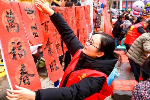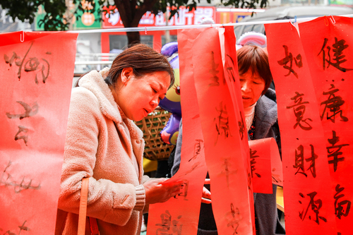 | 1月12日,县农民工服务中心党员志愿者袁淑琼在活动现场为群众整理晾晒写好的春联。 |