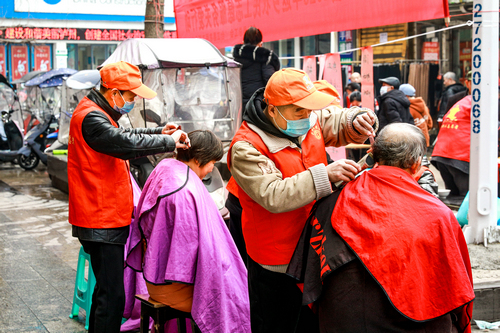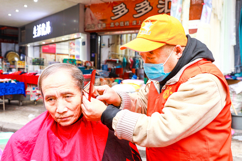 | 1月12日,合江县组织理发师志愿者在符阳街道开展为农民工和群众免费理发活动。 |