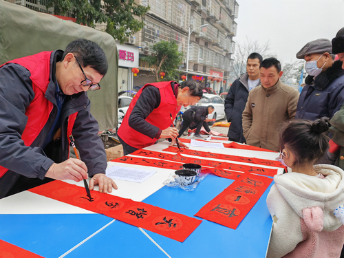 “别急别急,每个人都能拿到,每个人都有。”社会治理办公室工作人员曾霖说,“我们现场书写不少了法治春联,在为大家送上新春祝福的同时,也开展普法宣传。”