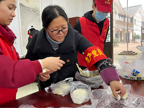 演出结束后,大家聚在一起包饺子,调馅、和面、擀皮、叠褶……不一会儿的工夫,桌上就摆满了一个个形似元宝的饺子。饺子出锅,热气腾腾,香味扑鼻,让人垂涎三尺。统战志愿者们将煮好的饺子端到老人手中,大家吃着热乎乎的饺子,拉着家常,脸上洋溢着幸福的笑容。五保老人潘永前说:“感谢大家的关心,你们工作这么忙,逢年过节还都惦记着我们,这心里头真是暖洋洋的!”