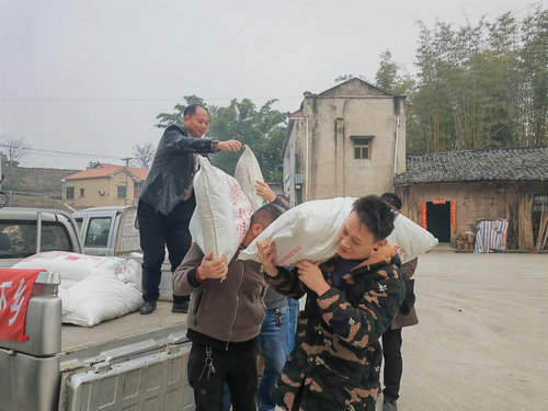 农资卡车驶入玄滩镇玄丰村六社唐大志院坝,郭永江大声地招呼着:“唐大志,唐大志,领肥料哟!”“他下地了,来了,来了。”唐大志的媳妇儿佘代琼放下手中的活,来到院坝里。