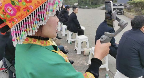 在活动期间,一位苗家咪啋正在通过手机直播,将节目实时播出给直播间的观众。精彩绝伦的杂技表演吸引了不少用户来到直播间观看点赞。在直播过程中,咪啋还热情地介绍箭竹当地的山水人文,欢迎各地游客前往箭竹做客,通过一块小小屏幕,传递出了箭竹人民的好客之情。