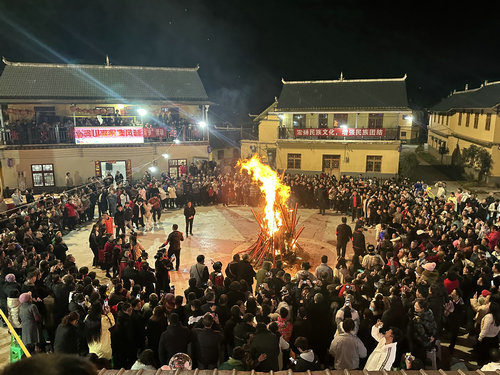 打好的糍粑被摆上了彝族同胞是最隆重、最热情的待客礼仪长龙宴,彝族同胞穿上精美民族服饰,唱起了祝酒歌,用美妙的歌声欢迎远道而来的客人,品尝彝家美食,感受浓浓的年味。长桌宴过后举行的云霄晚会上,彝族歌曲《不要怕》、武术表演《中华武术》、极具彝族特色的乐器合奏等节目赢得了现场群众热烈的掌声。晚上八点,随着篝火的燃起,活动迎来了高潮,熊熊大火照亮整个夜空,所有人一起随着音乐的节拍,手拉着手、肩靠着肩,跳起热情洋溢的舞蹈,唱起欢快的山歌,共享新年的喜悦。